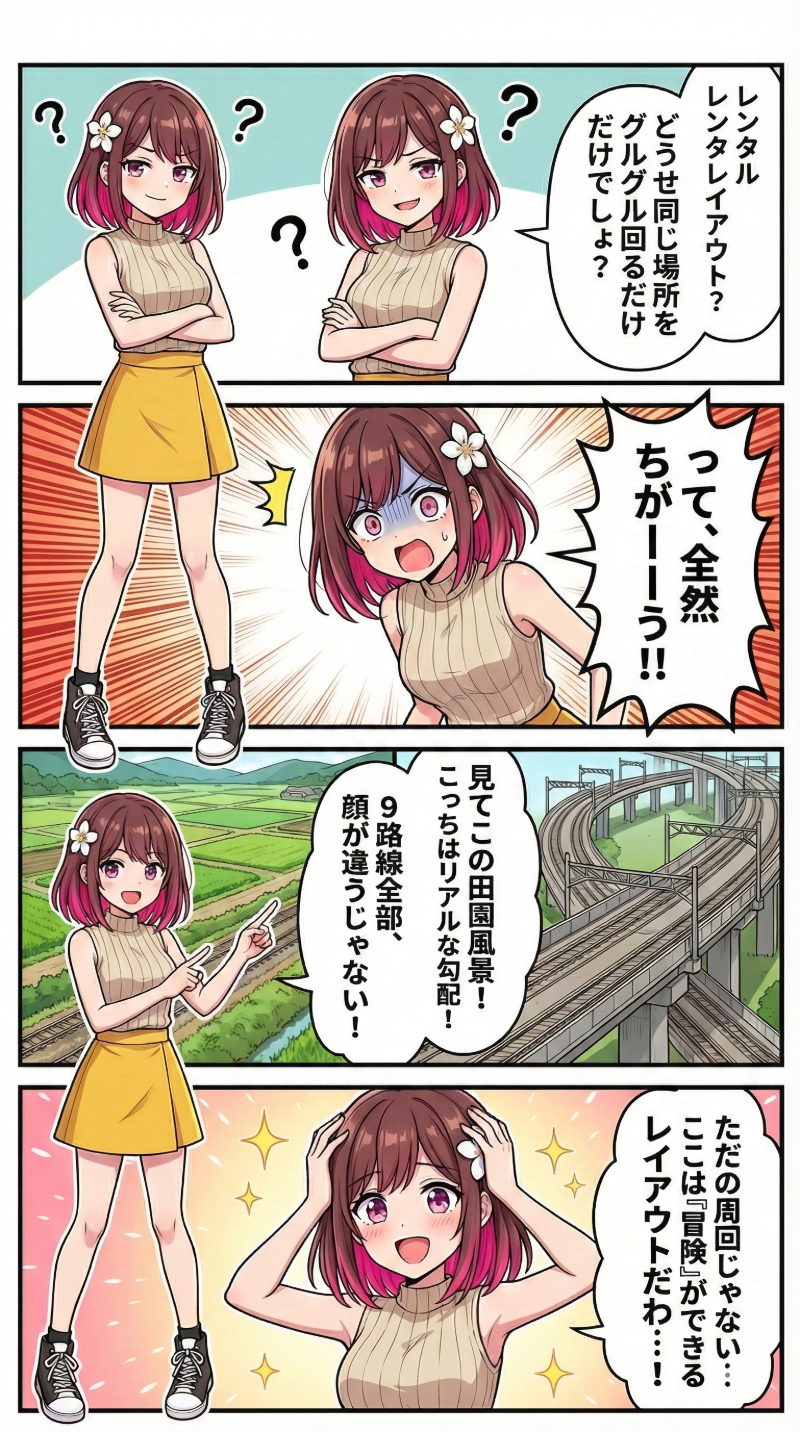 ただグルグル回るだけでなく、緑豊かな田園風景が広がる地上線や、リアルな勾配がある路線など、番線ごとに全く違う景色が広がっているんです。