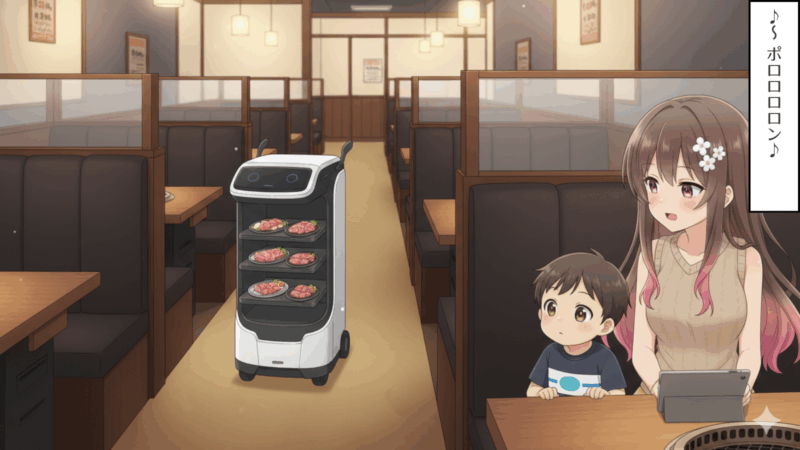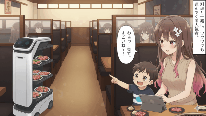 配膳ロボに大興奮! そして運ばれてきたお肉が…