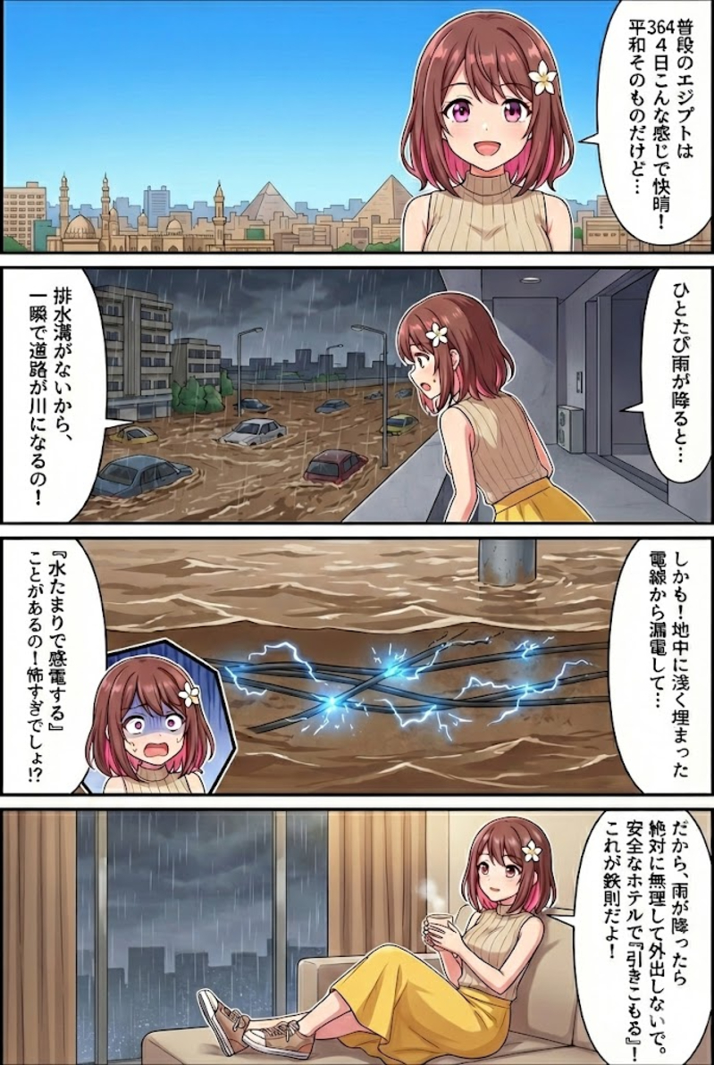年間数時間しか降らない雨ですが、ひとたび降るとエジプトは大パニックに陥ります。