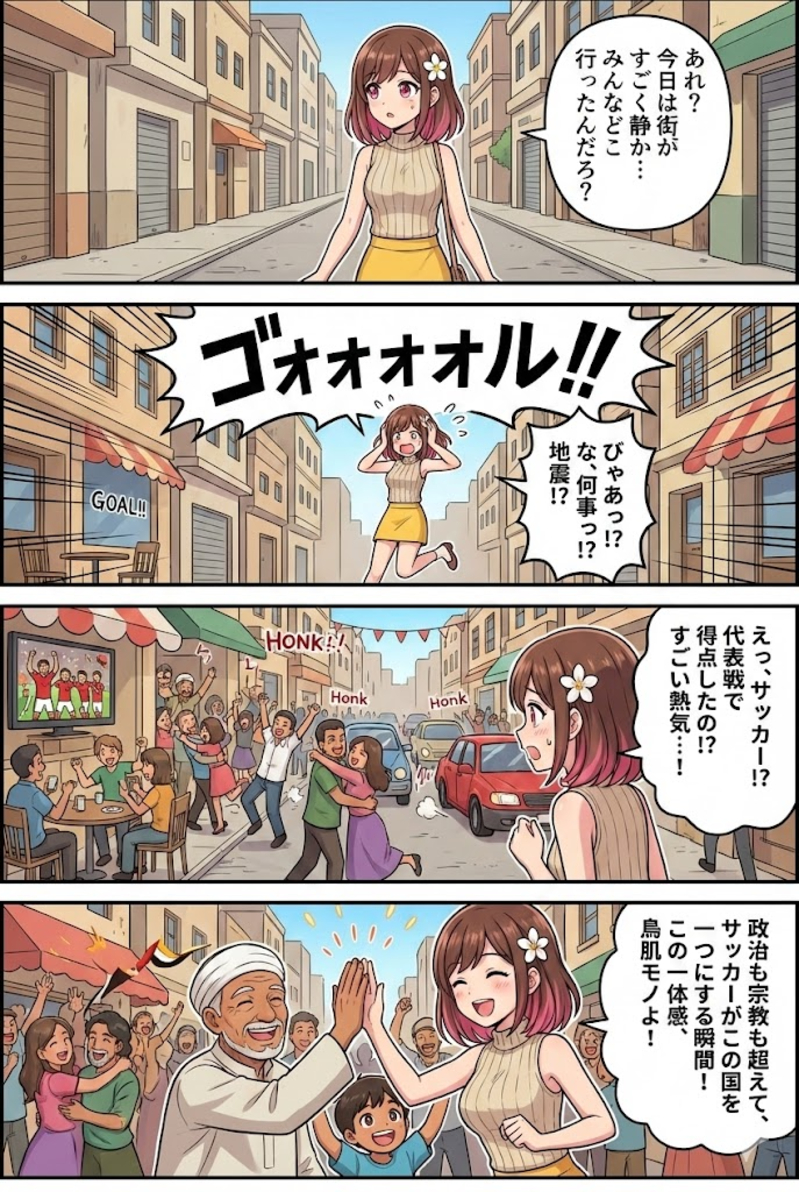 カフェの店員もお客さんも一緒にテレビに釘付けになる光景は、彼らの共同体意識と情熱の表れ。