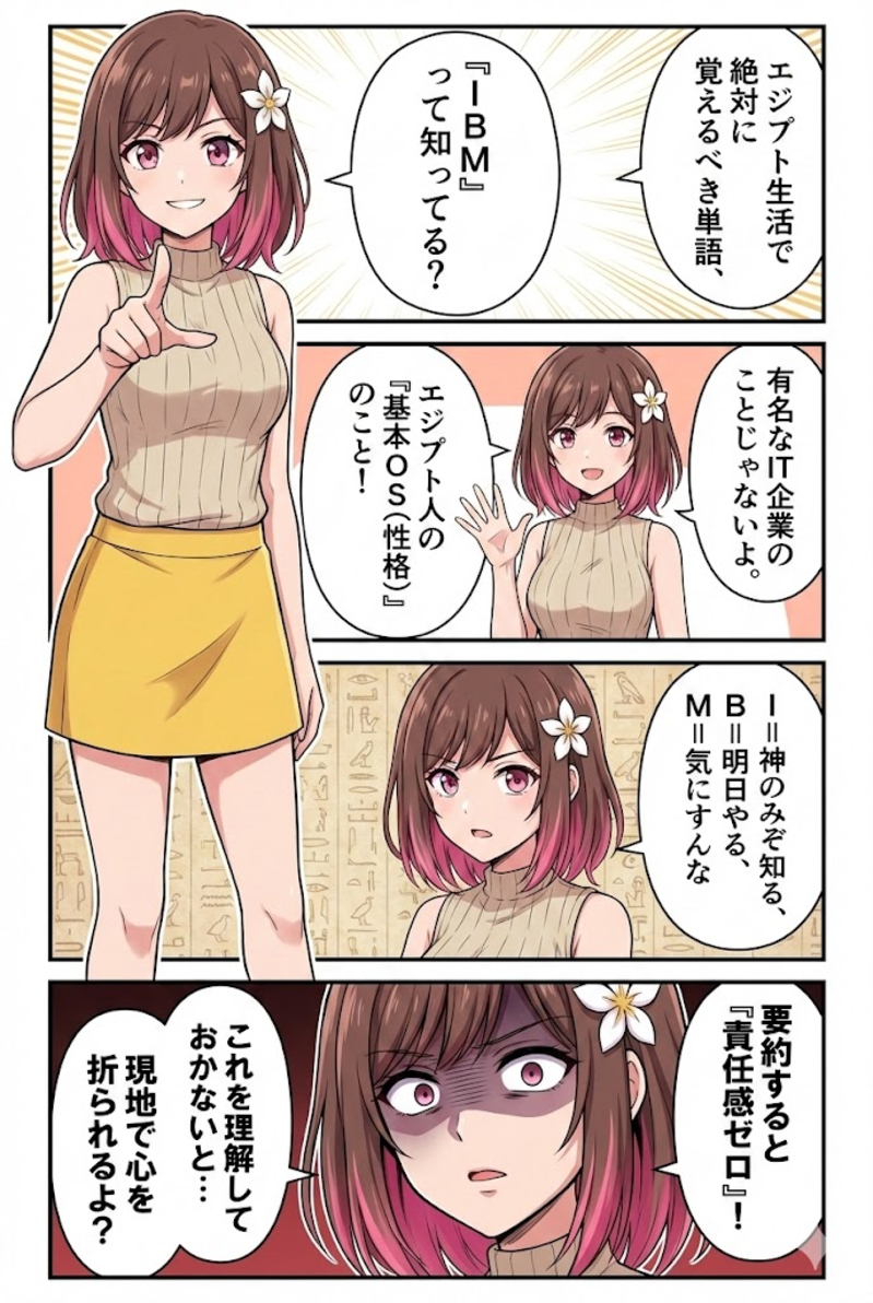 現地では、この頭文字をとって皮肉を込めて「エジプトのIBM」と呼ばれています。これを理解するだけで、エジプトで感じるストレスの半分は原因がわかってスッキリしますよ。