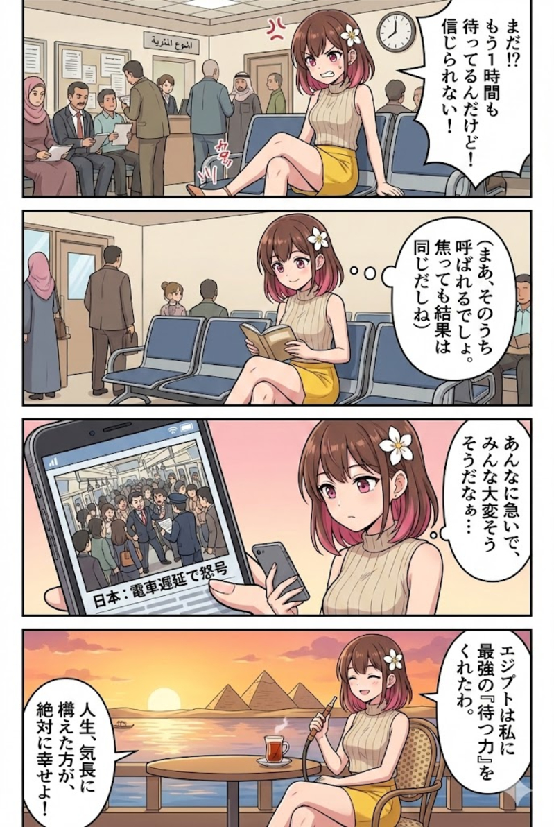 日本にいると秒単位で動く電車が当たり前で、どうしてもセカセカしてしまいますが、エジプトでは「ゆとりをもって気長に待つ」というスキルが強制的に身につきます。