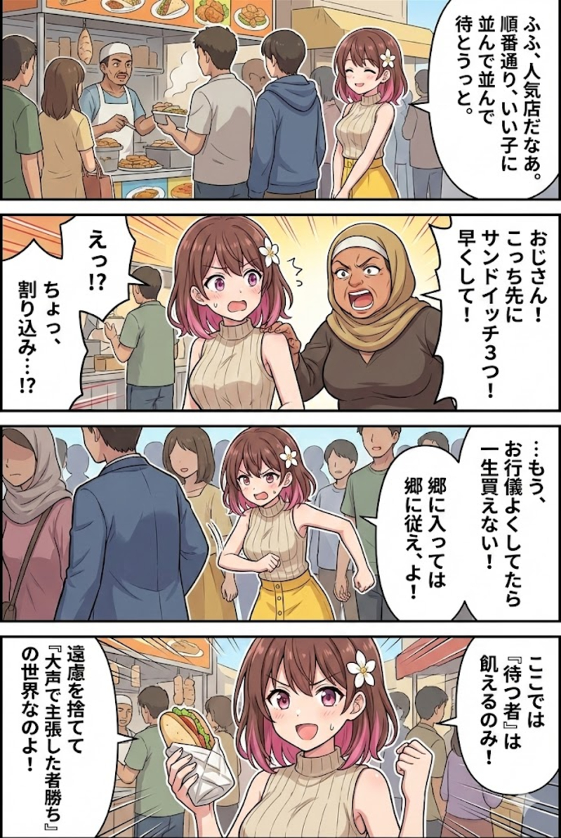 個人商店や受付では、隙あらば前に割り込んできます。特に車の運転は顕著で、信号待ちで前に少しでもスペースがあれば、後ろからガンガン詰めてきて平気で前に割り込みます。