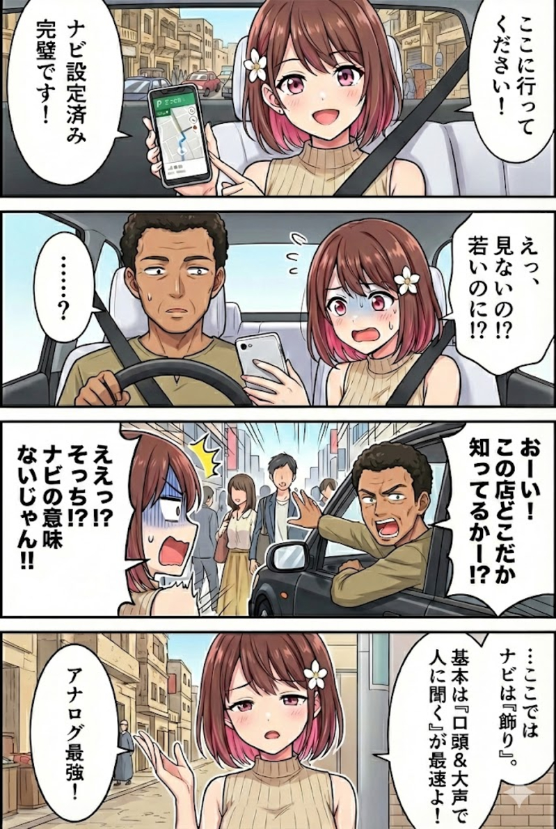 自分でルートを完全に把握し、「次の角を右」「あの看板の先を左」と具体的に指示し続けるか、Googleマップの音声ナビをアラビア語に設定して、ドライバーに聞かせ続けるのが最も確実です。