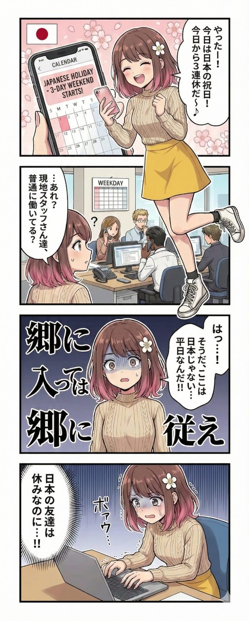 彼らが働いているのに、自分だけ「日本の祝日なので休みます」は通用しません。
